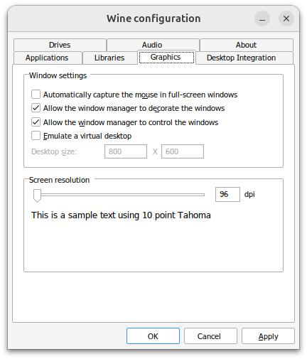 Unlike WineVDM, WINE comes with a nifty graphical tool to configure it. To launch this tool, enter winecfg at the terminal.