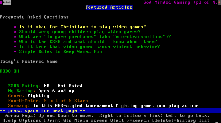 Navigation in LYNX is done through the arrow keys, SPACE bar, and various other single key shortcuts. There's no mouse support, but it's not like a mouse is really needed to use the internet like this anyway.