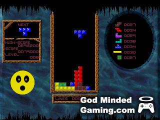 Now, the novelty of Super Acid Block Attack comes from what you could call its "mascot" - a yellow smiley face that sometimes appears to the left of the main play area. From time to time, it'll pop in to comment on your game. For example, if you're hesitating too much it might tell you to hurry up, or it may become surprised if you clear many rows in rapid succession. Along these same lines, it tends to become upset or worried when the pile is growing too high.