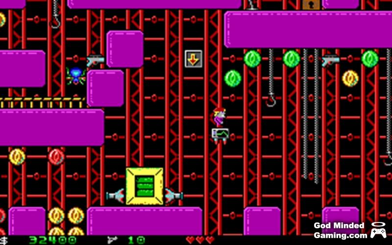 Within each level, you'll need to guide Mylo around until every crystal is collected. The tricky part is that these stages use switches, doors, elevators, and even powerups in such a way that you're forced to take a specific path through the level. Choosing to go in the wrong direction can leave Mylo trapped or render other parts of the stage unreachable. As an aside, this is why I called this a puzzle game - it's not enough to just run around and shoot your way through the game; you need to figure out the correct strategy in order to complete a level.